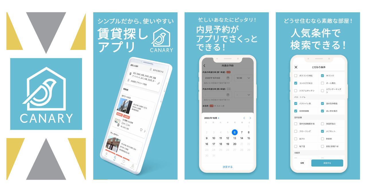 賃貸物件検索アプリ『カナリー(Canary)』の特徴として、下記の4つがあげられます。
