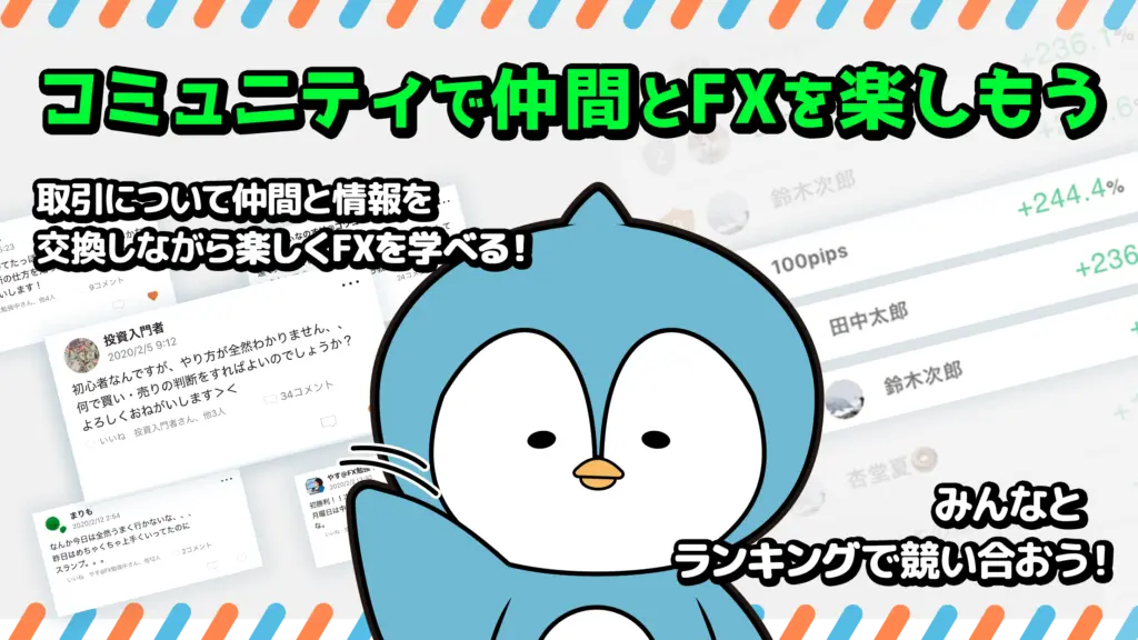 ゲーム感覚でトレードを体験でき、初心者でも使いやすいシンプルな画面とチャートが特徴。アプリ内コミュニティで意見交換もでき、FXの学習にも役立ちます。