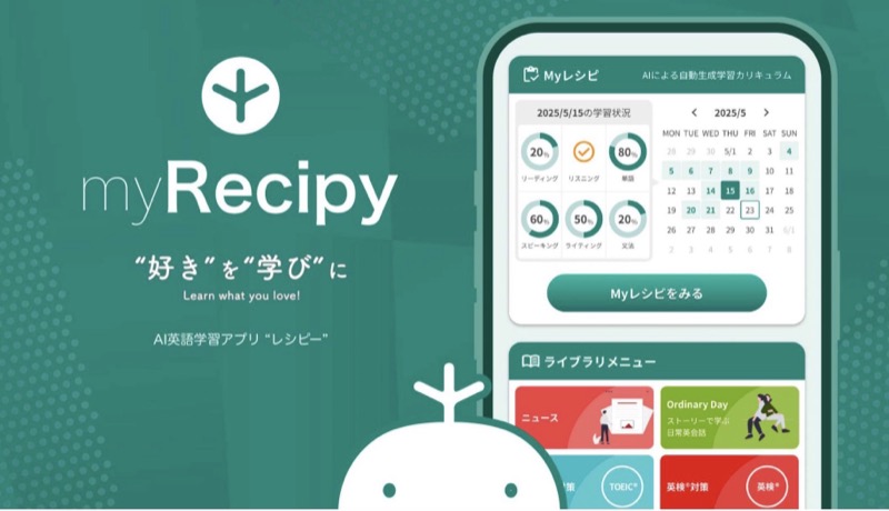 レシピーは、AIがあなた専用の学習カリキュラム「Myレシピ」を毎日作成してくれる総合英語学習アプリです。