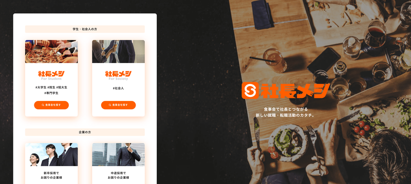 社長メシは、就活生や社会人が社長と「食事」を通じて交流できるマッチングサービスです。